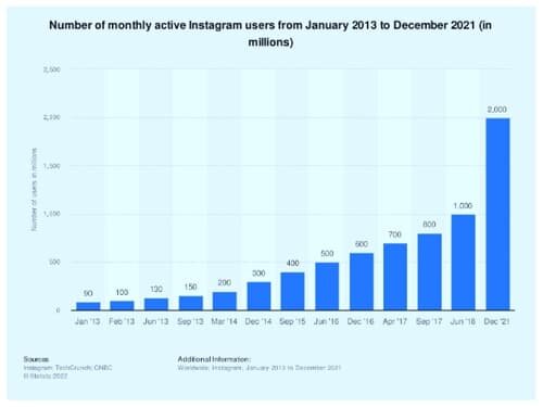 Below is a graphic with the growth in terms of registered users on Instagram from January 2013 to December 2021.